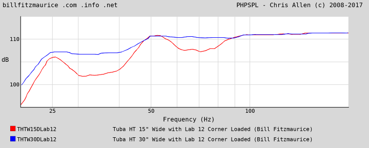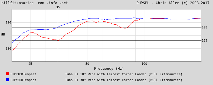 Here's an 18" THT and a 30" THT. The 5db difference at 35Hz means the 18" cab will require 3.2 times the power compared to the 30" cab to create that frequency at any particular volume. If a 30" cab is at 100 watts, the 18" cab would require 320w to match the output.