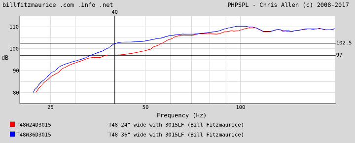 The 5.5dB difference between the 24" and 36" T48 at 40Hz is huge. The 36" cab would only require 127 watts to match the output of a 24" cab at 450 watts.