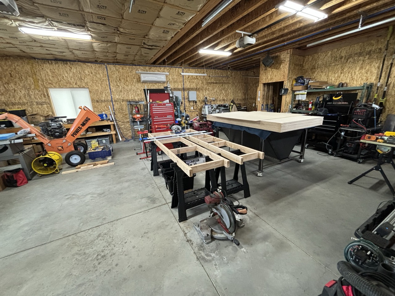 Had some other shop projects I needed to work on to clear space to start this build. Did that and now have the BB in the shop and built my cutting table. Pretty much ready to start cutting panels. Santa in the brown truck comes tomorrow with all the drivers!