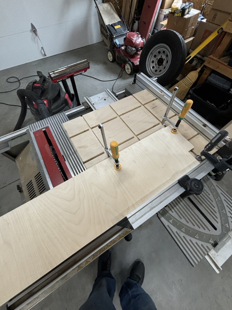 Btw I sprung for one of these for a saw sled. https://www.amazon.com/dp/B073PGP96S Man I'm glad I did. The clamp kit https://www.amazon.com/Kreg-Tool-KMS752 ... B0747T9MHJ is ridiculously another $23 but it is a must IMO. I know I could have made a sled cheaper but this thing is really nice. The track gives very nice cross cuts on a 4' sheet and my table saw is set up to final trim the inside panel dimension of 23" and I'm just leaving it there so every interior panel is exact.