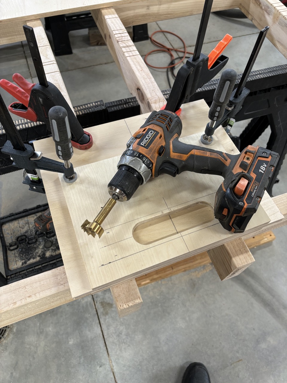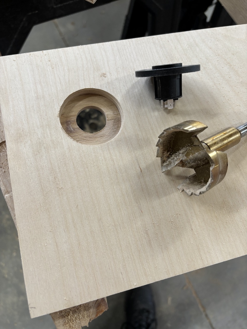 My plan is to inset the NL4 connectors so they're just flush and put a backer behind that for the screws to go into. This is me experimenting with that inset and test fitting in some scrap. Again, using Forster bits. A 2" in this case for the inset and a 1" for the center hole.