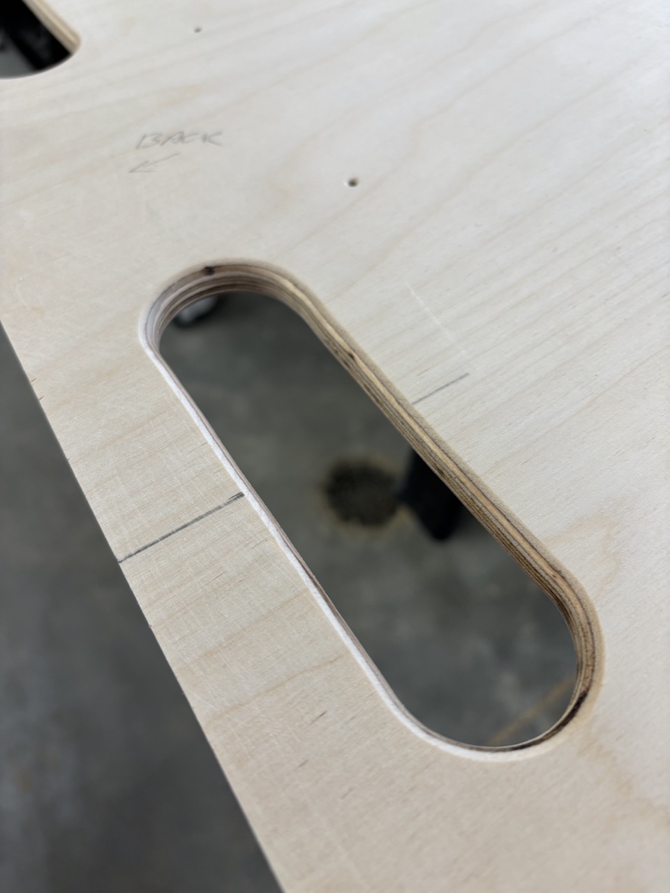 Spent a lot of time figuring out just how I want to do the hand holds. Experimented around with several iterations on a router template. There may be better ways but this is what I came up with. Note using the Forster bit to remove some material really helps. If you've got a better router and better bit you might not need to but this helped with my wimpy router. I'm using a 1/4" trim bit with a bottom bushing so template has to go underneath the work.