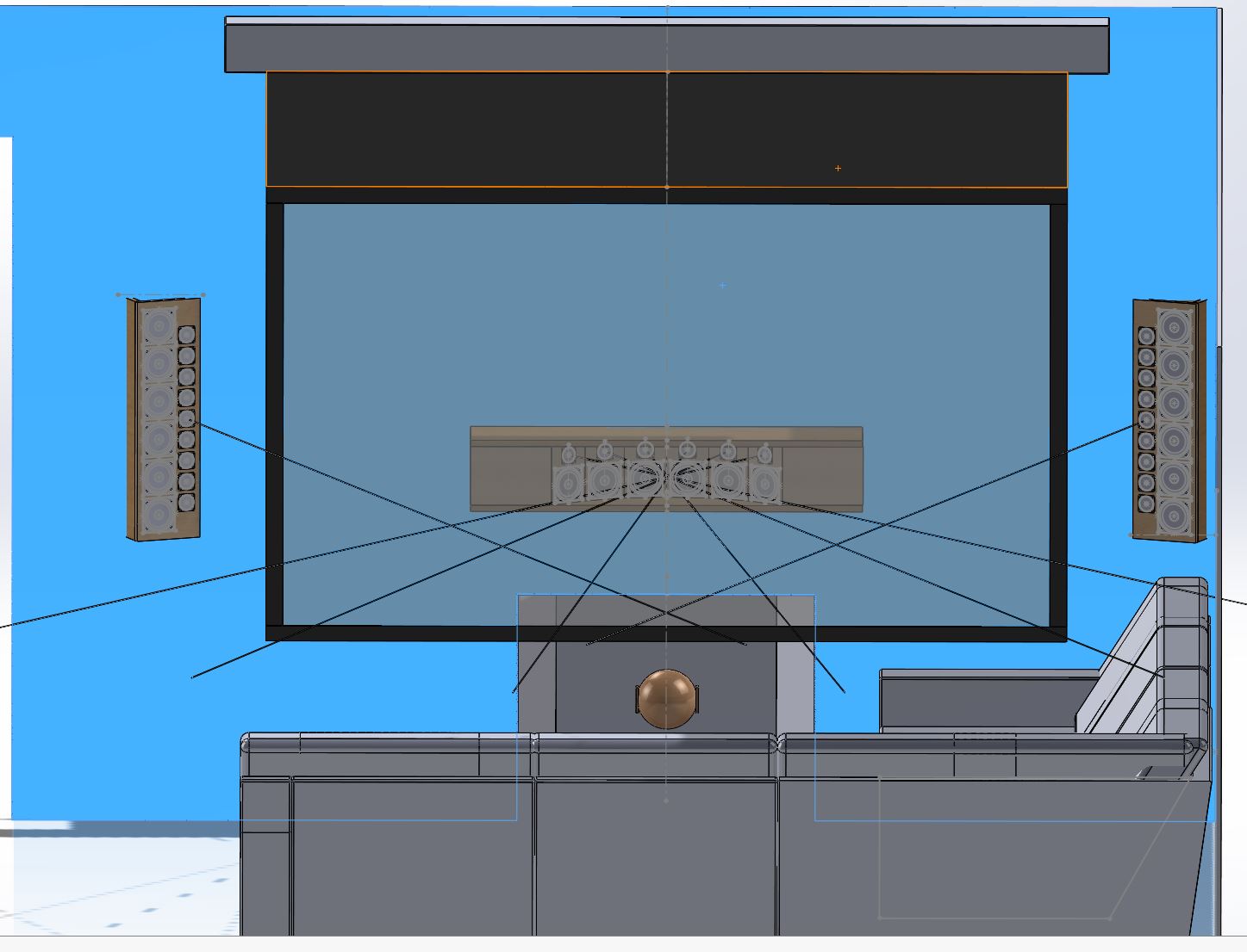 Right now I'm slowly working on getting the LCR SLAs designed for the front stage. Please take a look at the attached picture of my CAD models. For size reference, the screen is a 103" diagonal screen (planning for a Seymour roll down acoustically transparent screen). And there is a rough model of a head in the main listening/viewing position about 10.5 ft from the screen.